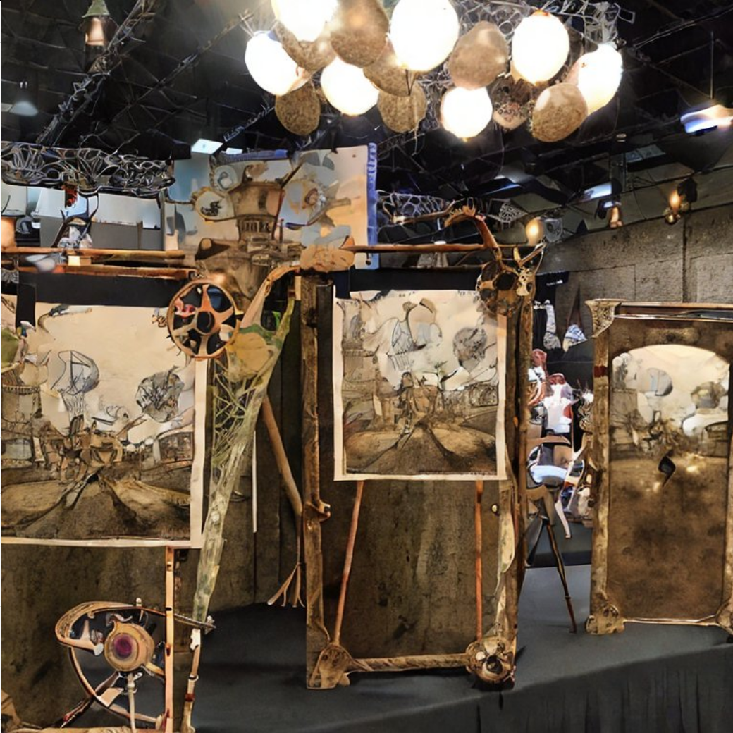 Les murs de ce stand sont recouverts de gravures de mécanismes complexes et de dessins de machines volantes. Les gens se pressent autour, certains vêtus de costumes d'époque et d'autres portant des accessoires steampunk.